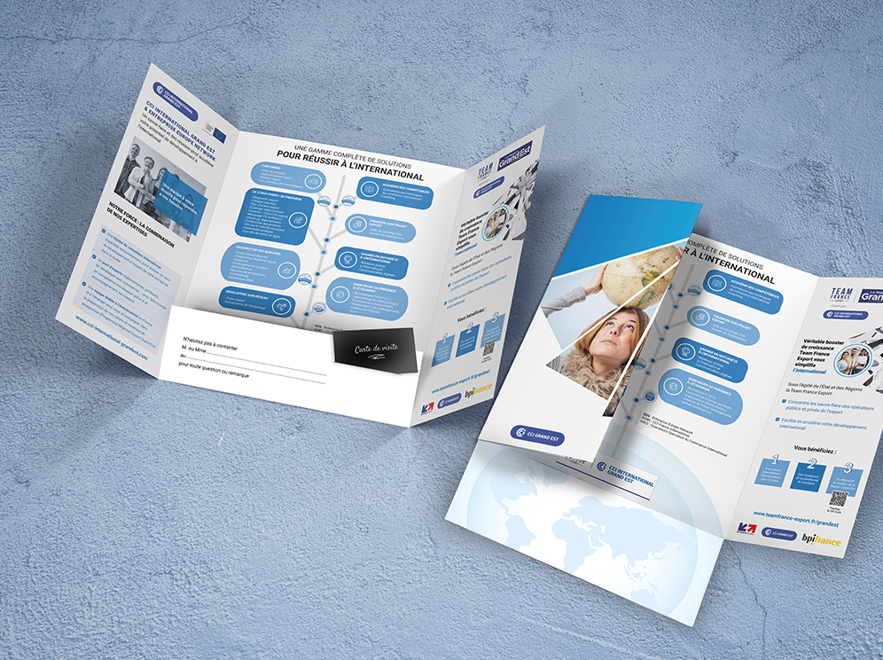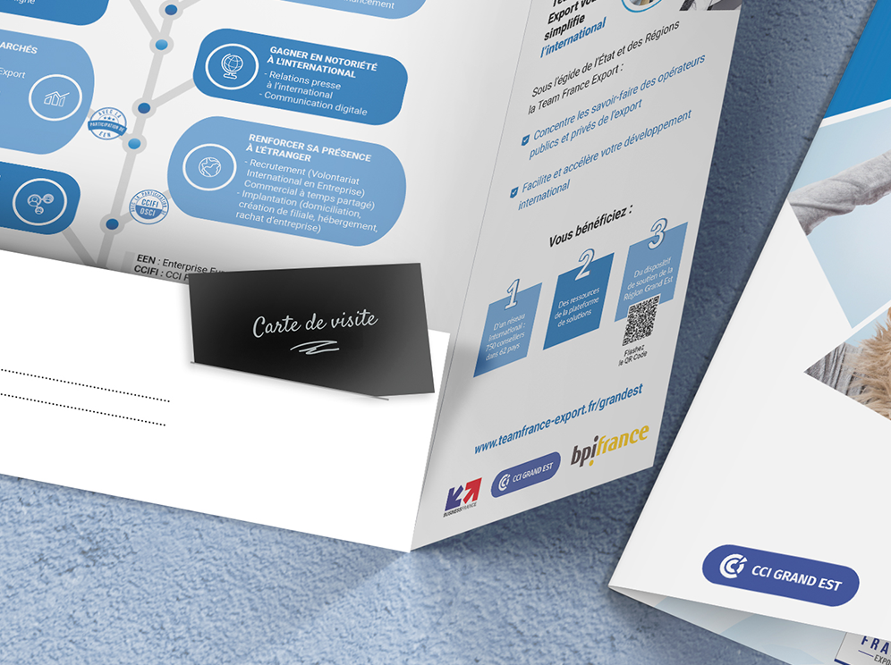 J’ai conçu une chemise porte-documents à la fois fonctionnelle et élégante, destinée à accueillir des documents ainsi que des cartes de visite. Ce support, pensé pour être laissé chez les clients, permet également de valoriser les différentes prestations de la CCI International Grand Est tout en renforçant son image de marque.